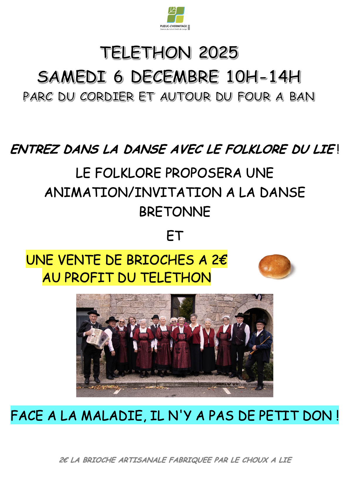 Le folklore propose une animation/ invitation à la danse bretonne ainsi qu'une vente de brioche au profit du Téléthon le samedi 6 décembre de 10h à 14h.