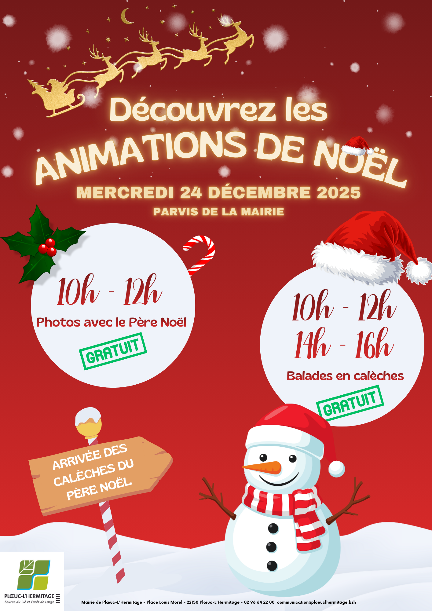 Découvrez les animations de Noël !- Prenez vous en photo avec le Père-Noël de 10h à 12h- Baladez vous en calèche de 10h à 12h ainsi que de 14h à 16h